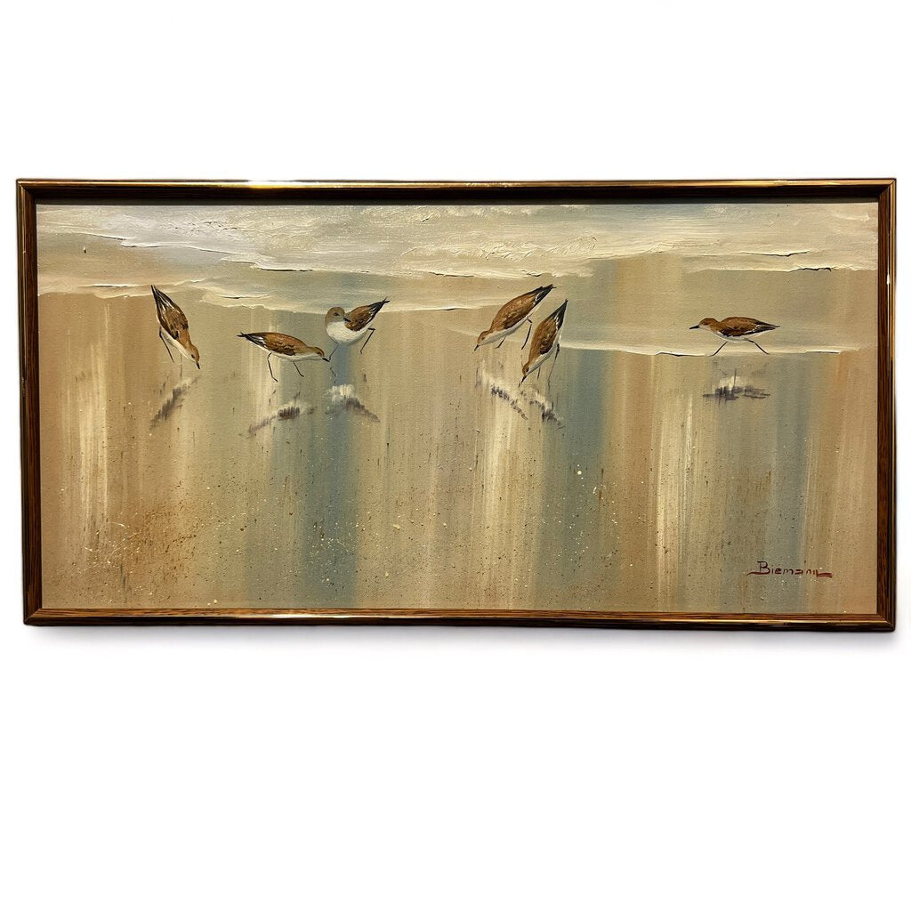 Mid-Century Seascape Ocean Shore Sand Piper Birds by: Herman Biemann (1930-2015) 31"x16"