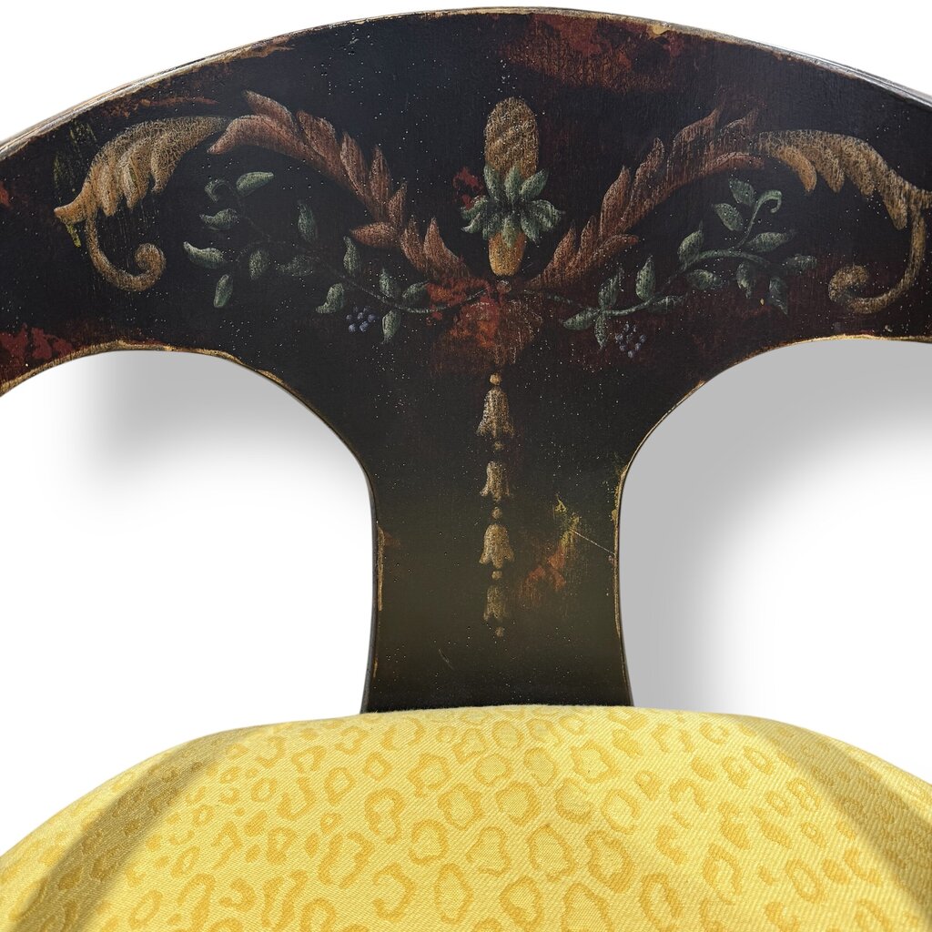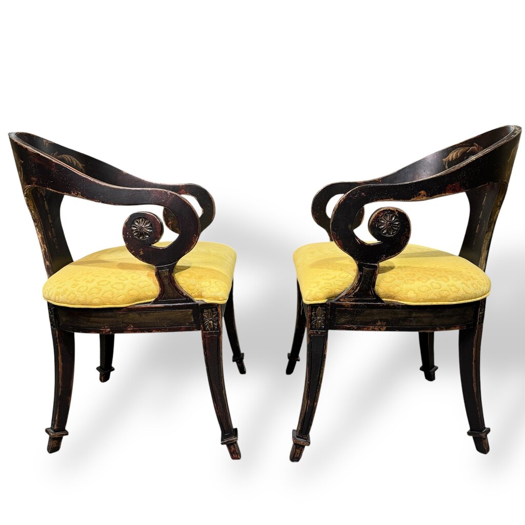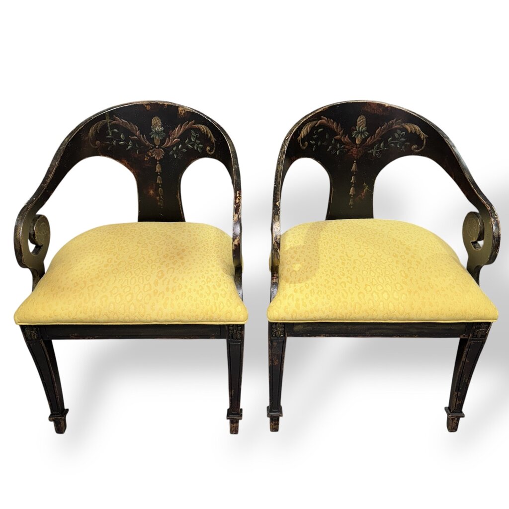 Pair of Habersham Neoclassical Hand-crafted/painted Black Lacquered Chairs Upholstered in Yellow Leopard Patterned Fabric