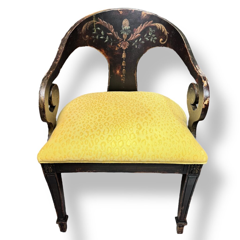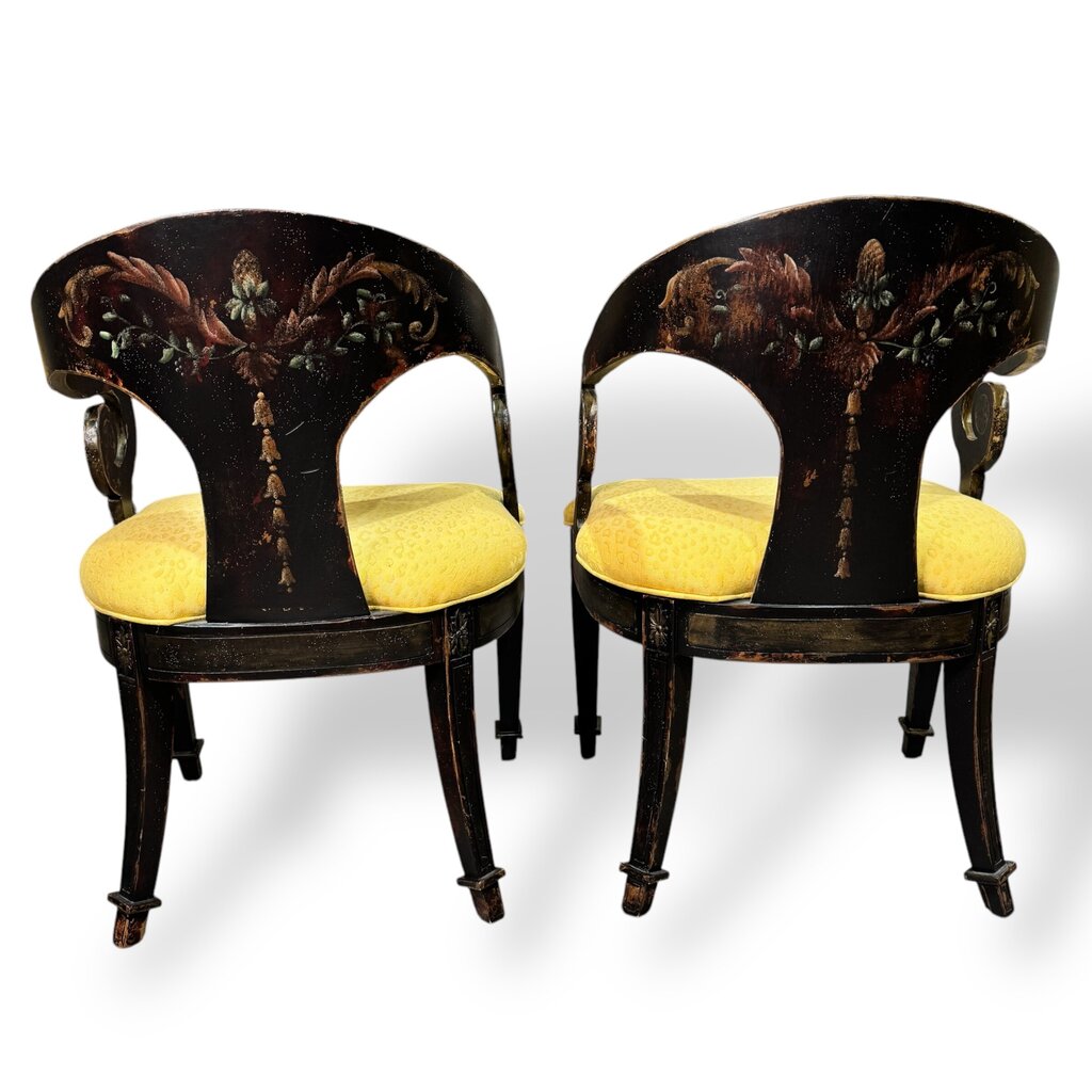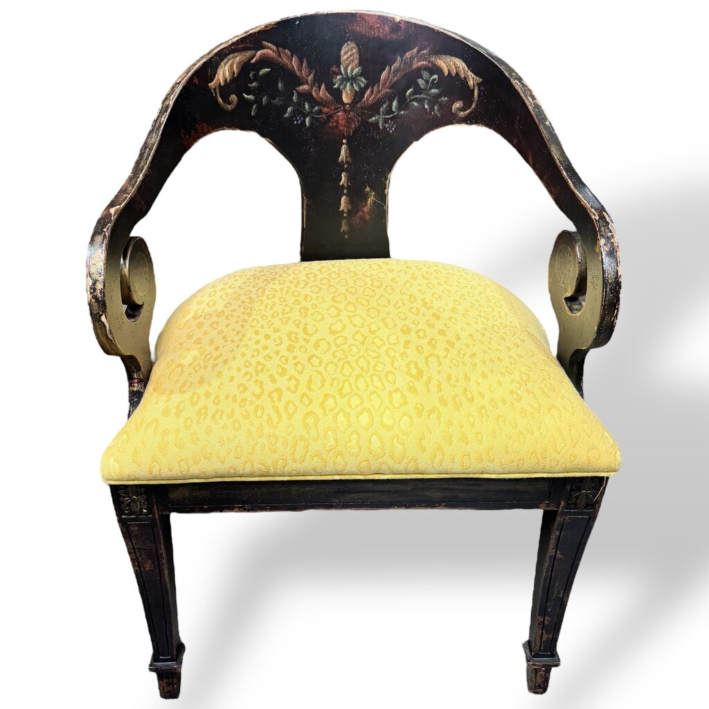 Pair of Habersham Neoclassical Hand-crafted/painted Black Lacquered Chairs Upholstered in Yellow Leopard Patterned Fabric
