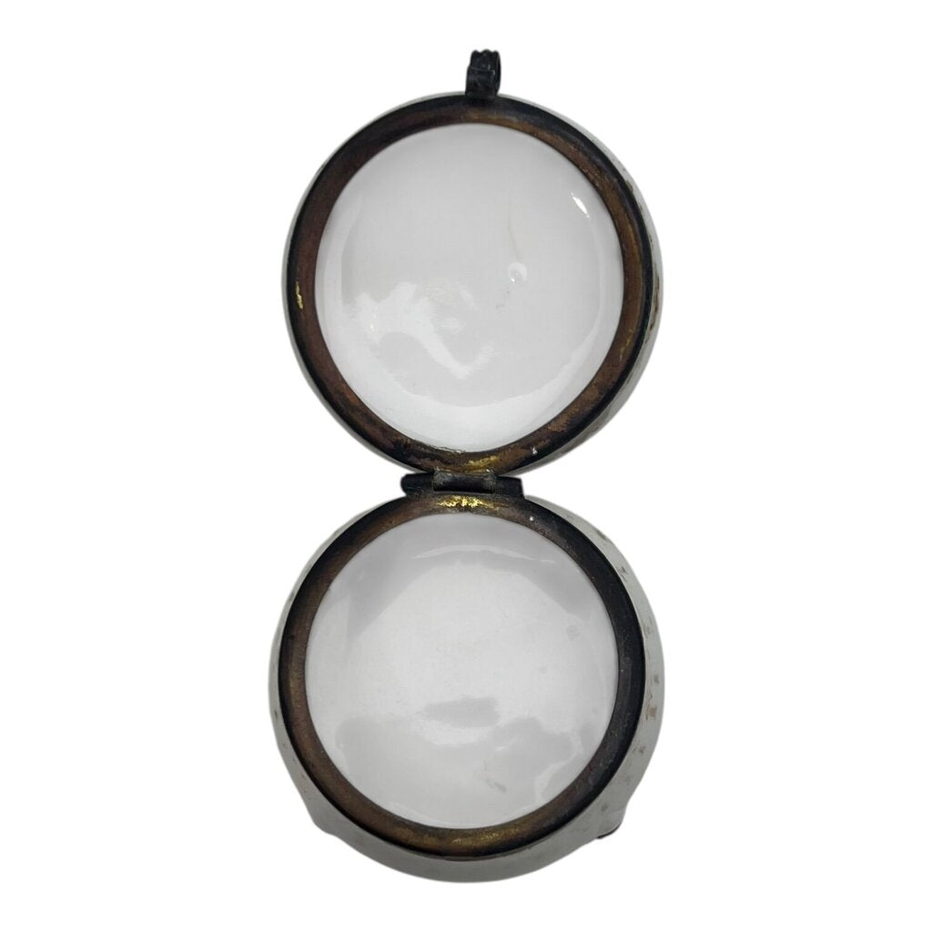 Vintage Hand Painted Gold Accented Porcelain Trinket Box w/Hinged Lid w/Man and Woman On Farm 2"Dia x 2H